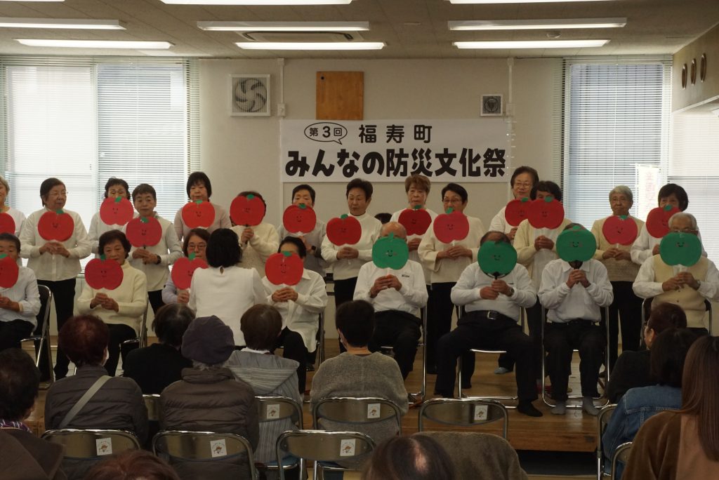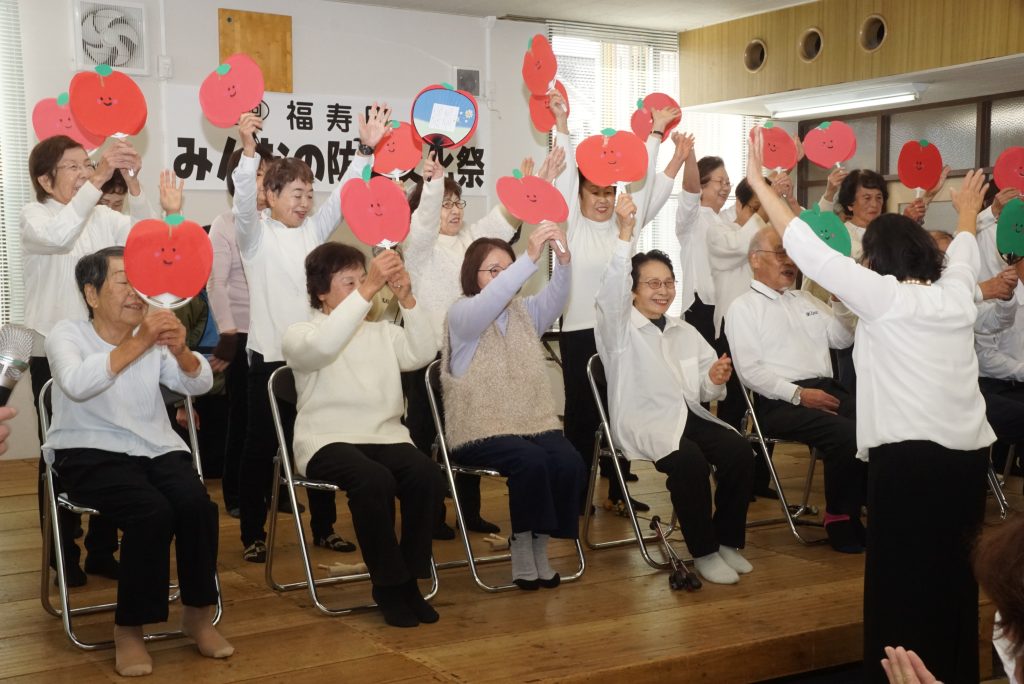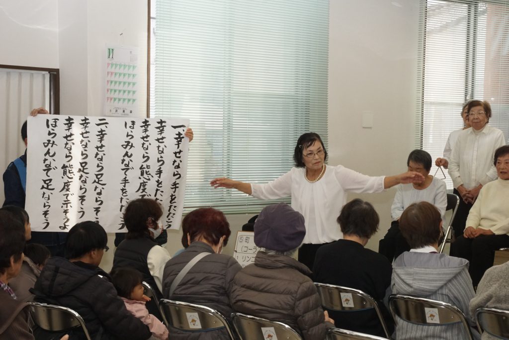 ↑福寿町老人クラブ連合会による合唱 リンゴの唄・証城寺の狸囃子・幸せなら手をたたこう